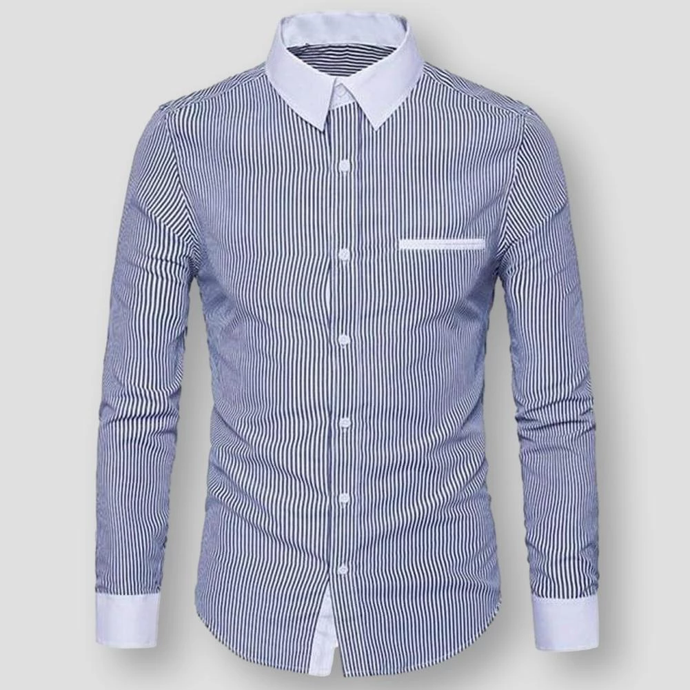 A handsome addition to the smart-casual portfolio. Cut in a slim fit from a soft, breathable blend, this long-sleeve shirt is adorned with a striped pattern that subtly elongates the figure. Style with tailored pants and oxfords for a refined ensemble.