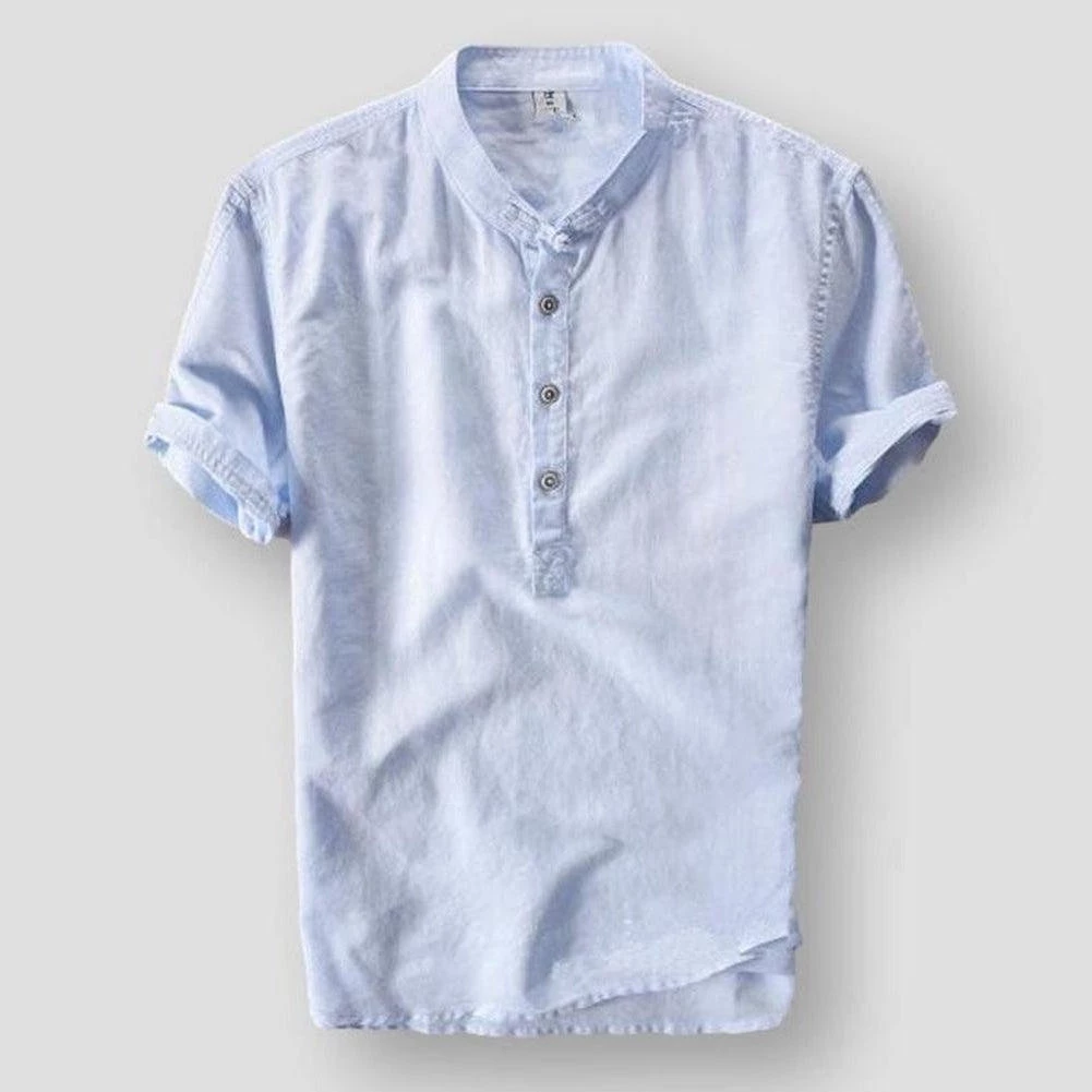 Stay cool and stylish on warmer days with this handsome linen blend shirt. Cut in a relaxed fit, it boasts a 4-button collar and blends seamlessly into your vacation portfolio. Perfect for sunset strolls on the beach or seaside dinner dates.Â