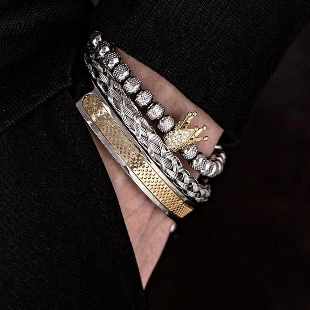 Step up the jewelry game with this stunning three-piece bracelet. Made from premium stainless steel, it fuses a braiding technique with royal motifs and sparkling beads to instantly elevate any off-duty ensemble.