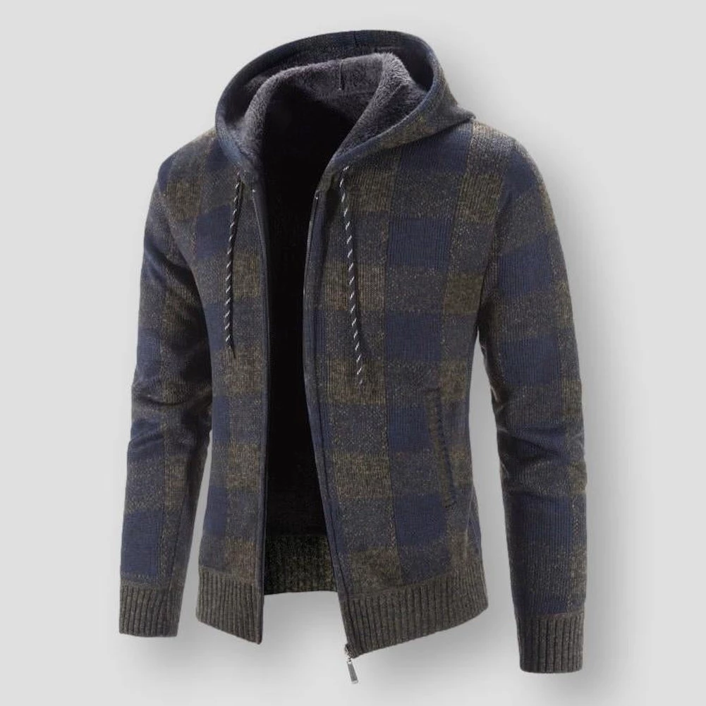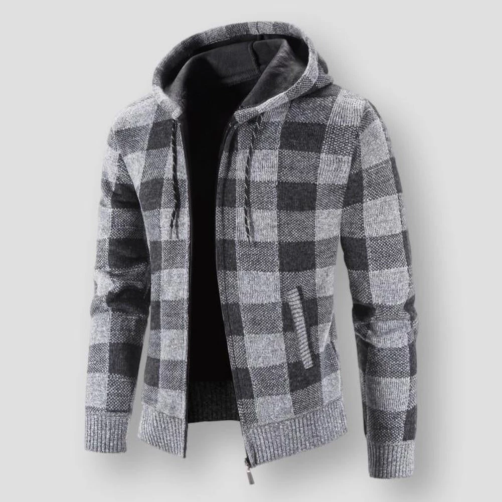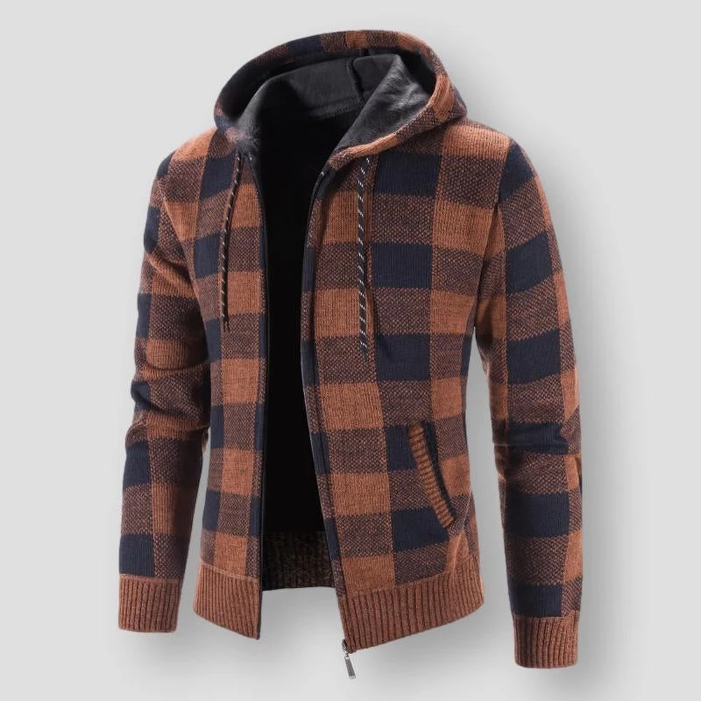 A plaid pattern defines this stylish year-round closet staple. Crafted from a cozy blend for a delightful warmth, this cardigan layers effortlessly over casual shirts and pairs beautifully with denim jeans or corduroy pants. Complete with an easy-cinch hood and handy pockets.