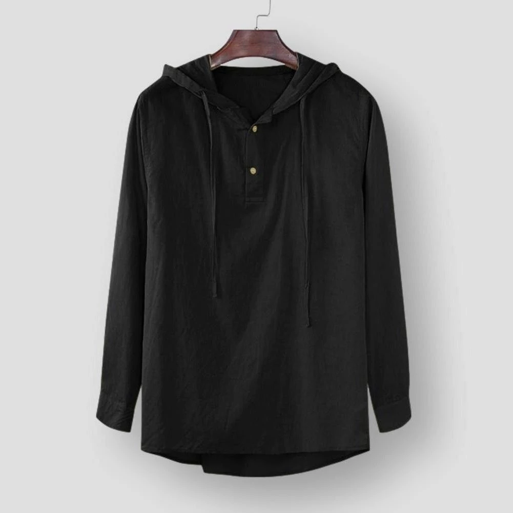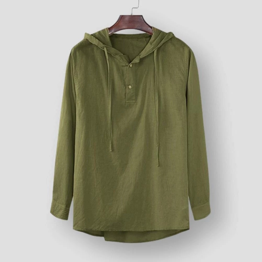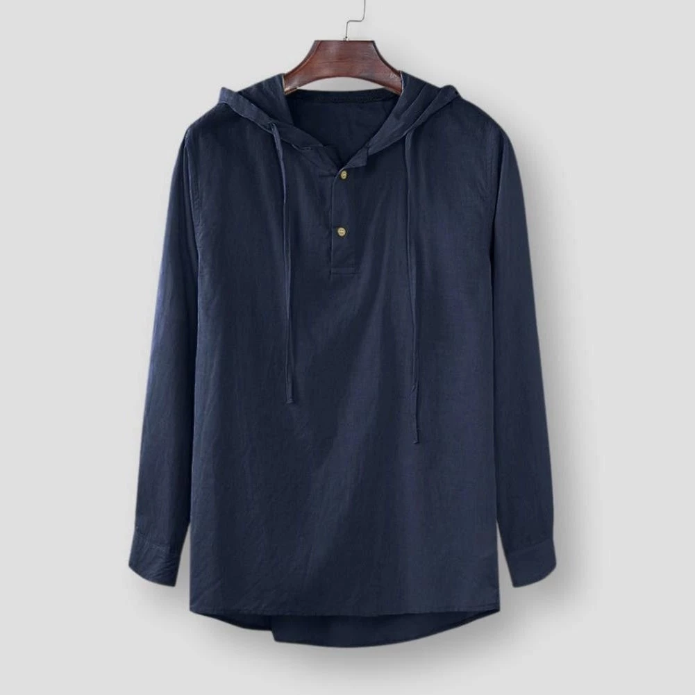 A relaxed fit and soft cotton-blend construction make this shirt the perfect warm-weather staple. The minimalistic solid-color design is complete with a hooded collar and looks great paired with linen shorts or trousers for a relaxed summer look.