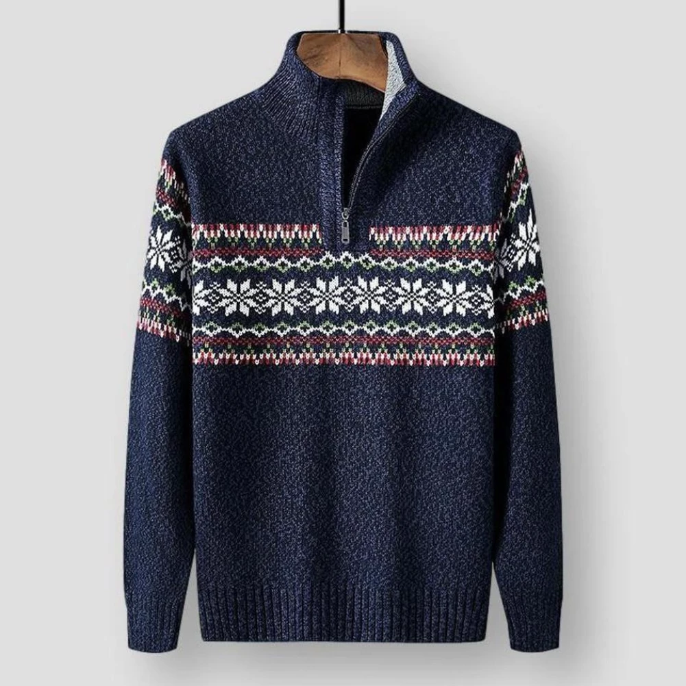 A cozy and charming companion to keep around during the festive season. Beautifully knitted from the softest blend, it delivers a pleasant warmth on cooler days, while the colorful pattern perfectly matches the holiday spirit. Complete with a quarter-zip collar for added coziness and protection.