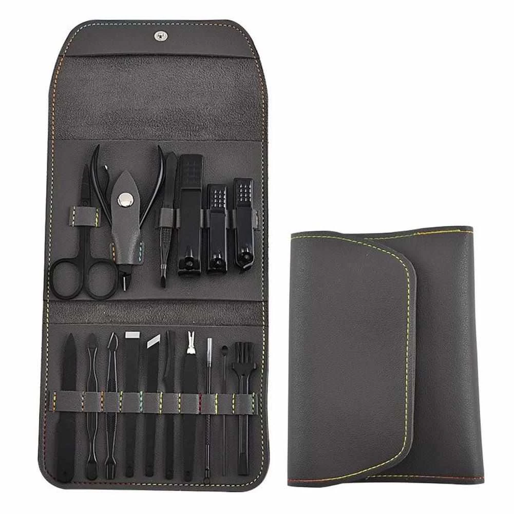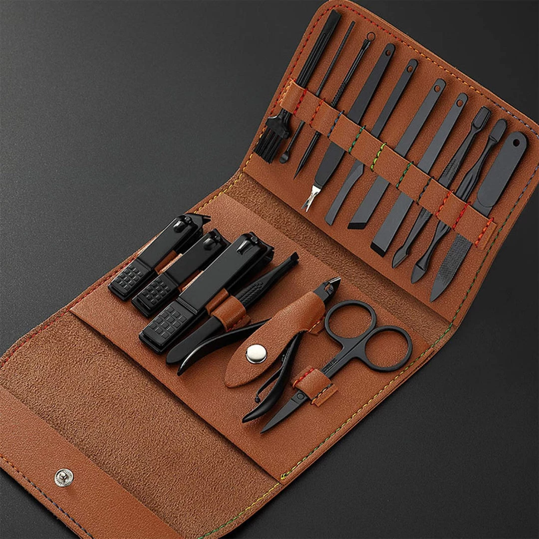 Luxury 16-piece nail kit featuring tempered stainless steel tools within a compact case made of premium PU leather.  Neatly kept in the perfect travel size.