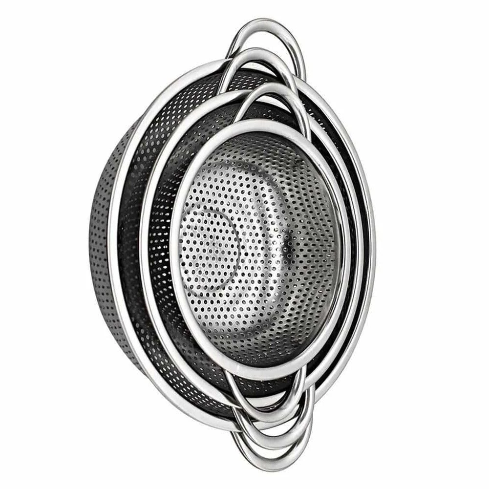 All-over perforated stainless steel colander for a quick and thorough draining. Completed with an easy-grip handles for convenient handling. The tiny perforations will keep even the smallest food from slipping out. Perfect for draining pasta or washing fresh fruits and veggies. The nesting design is ideal for space-saving.
