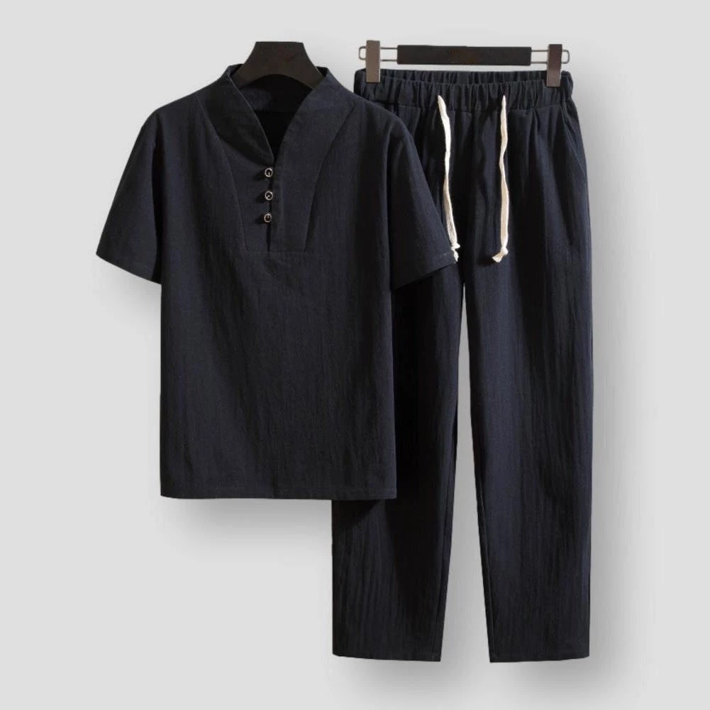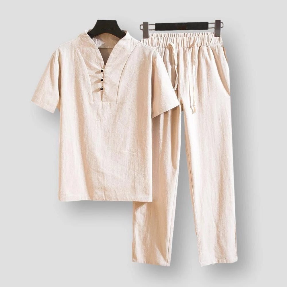 A luxuriously soft cotton-linen blend means easy comfort on warm, summer days. Perfect for relaxing days on the beach, this set boasts a laid-back shirt and matching loose pants with an elastic waist for a custom fit. Team up with espadrilles for a handsome holiday ensemble.