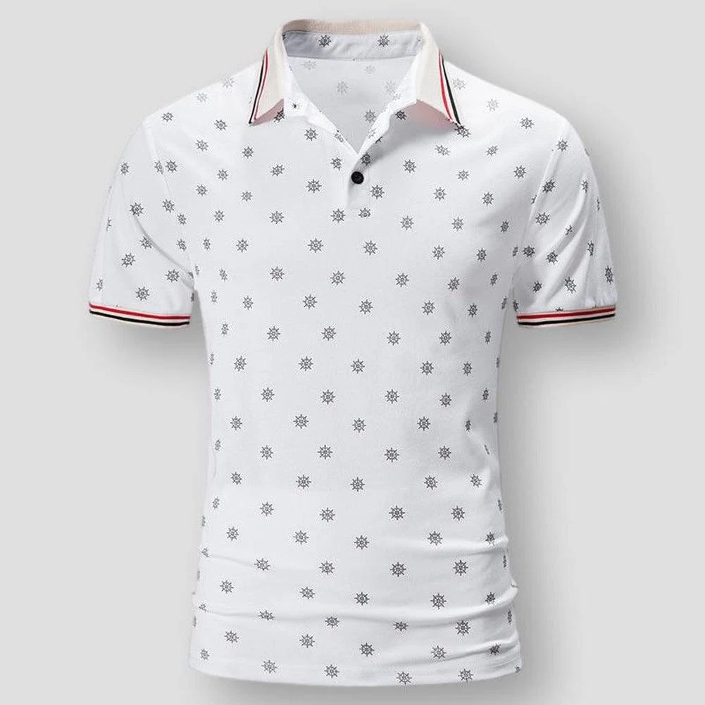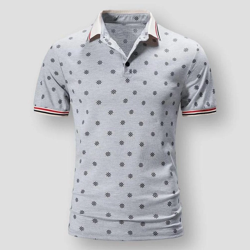A ship wheel print infuses marine motifs into this handsome polo shirt. Imagined in anti-pilling cotton for excellent all-day comfort, this shirt boasts a slim fit that blends right into your casual portfolio.
