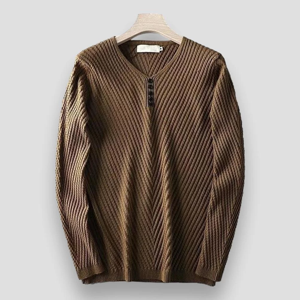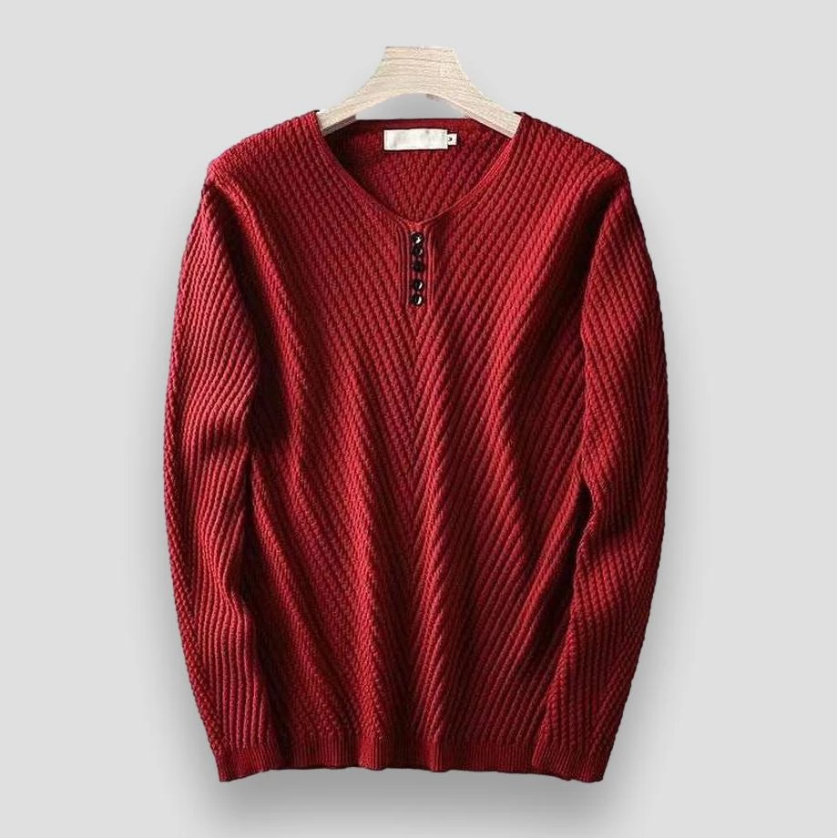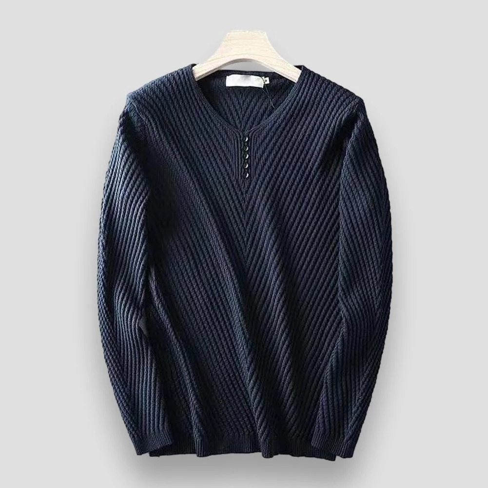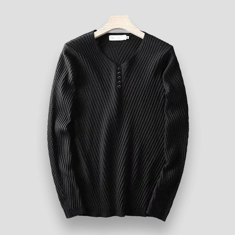 A year-round handsome addition to off-duty ensembles. Imagined in an ultra-soft, stretch-infused blend, this pullover displays a refined long-sleeve silhouette with a V-neck collar and decorative buttons. Style it with denim jeans and an overcoat for an effortless fall-winter look.