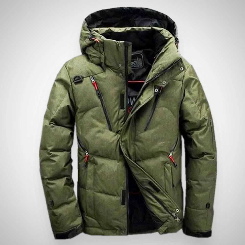 Superbly crafted to easily withstand the elements. Imagined in our signature cotton-polyester blend, this utilitarian winter jacket boasts a generous duck filling for pleasant warmth on cooler days. Reinforced with a hooded collar, it’s the ultimate cold-season staple you’ll reach for season after season.