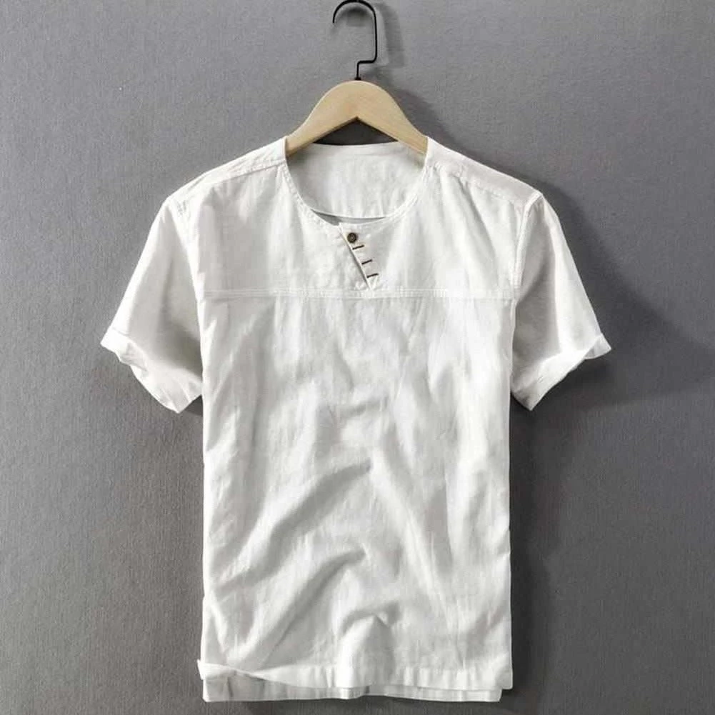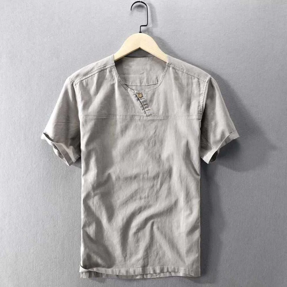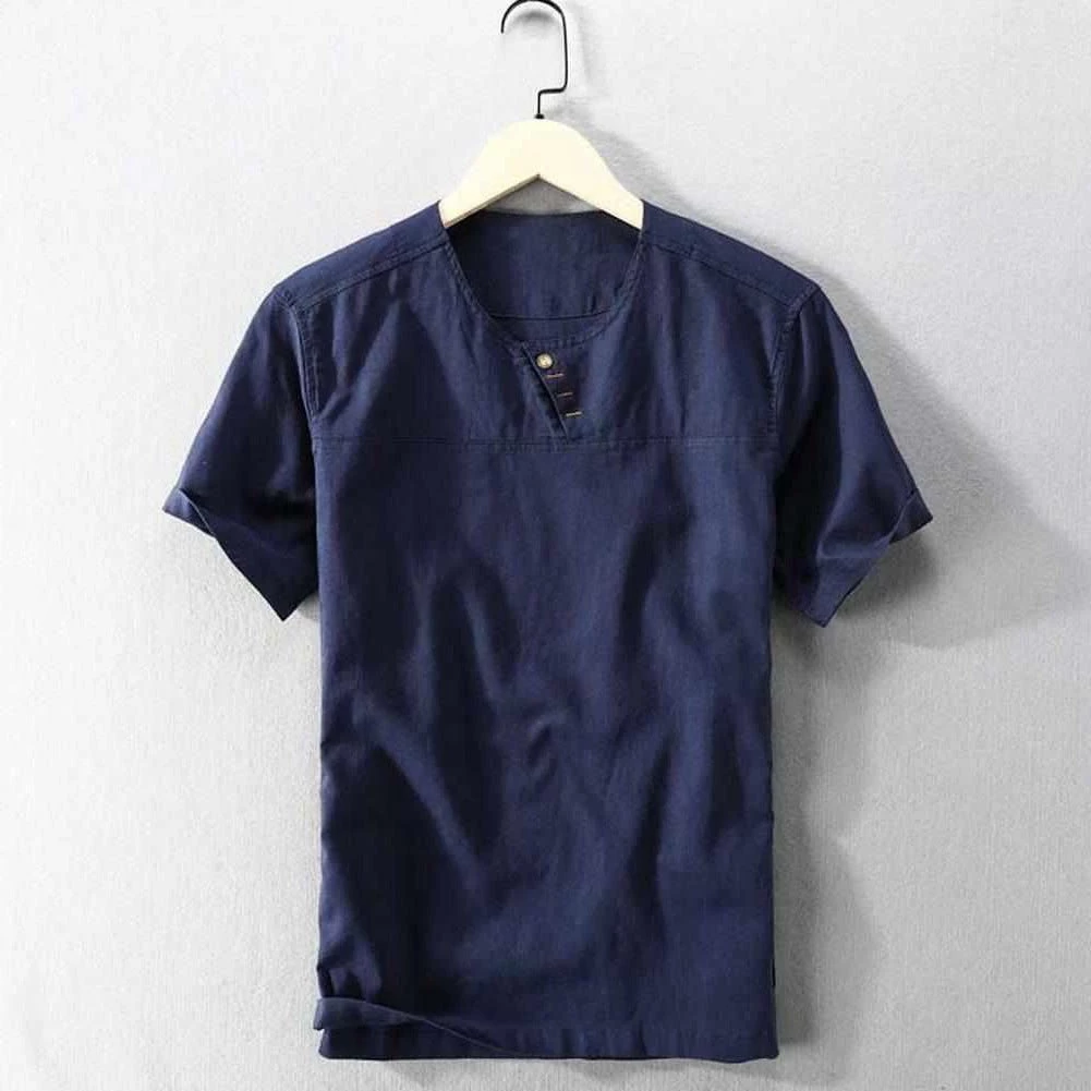 Asymmetrical single button collar lends a modern touch to this summer staple. Cut in a relaxed fit from the softest cotton-linen blend, this short-sleeve shirt keeps you fresh and cool as you go along your day. Team up with linen shorts or chinos for a refined look.