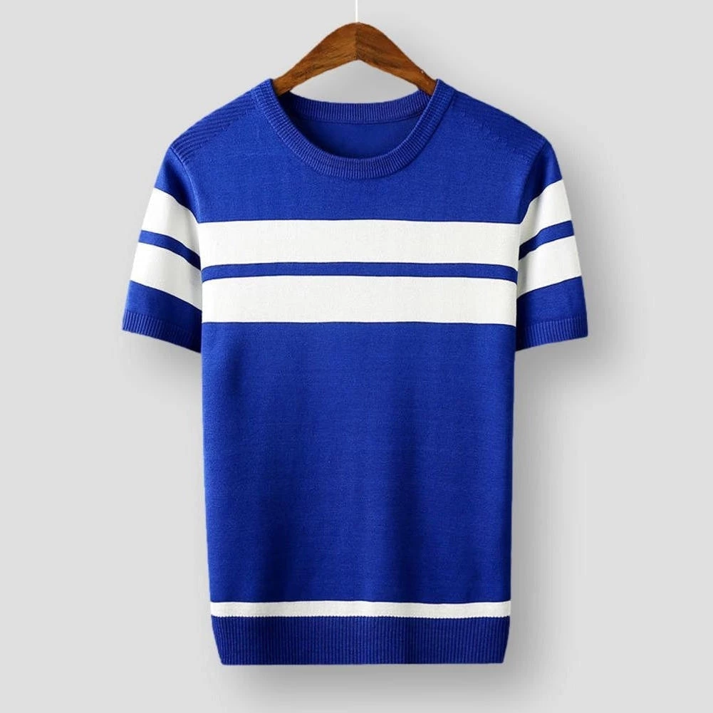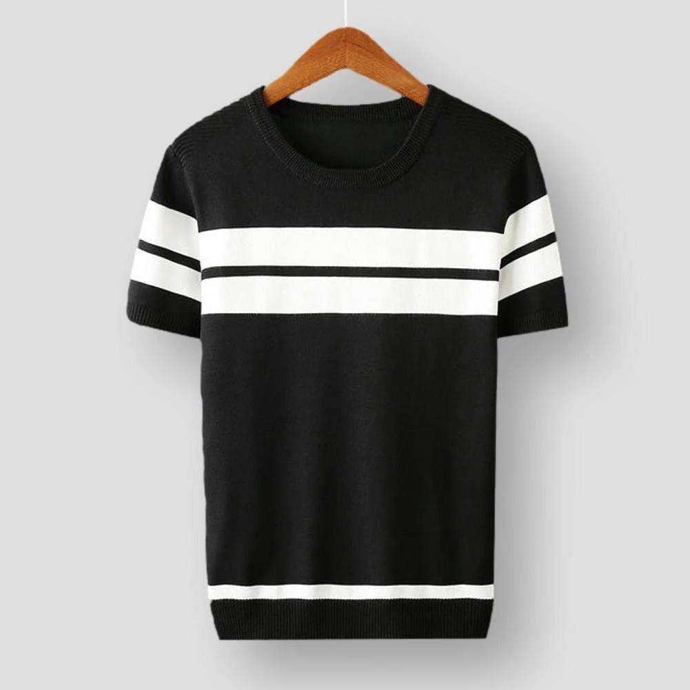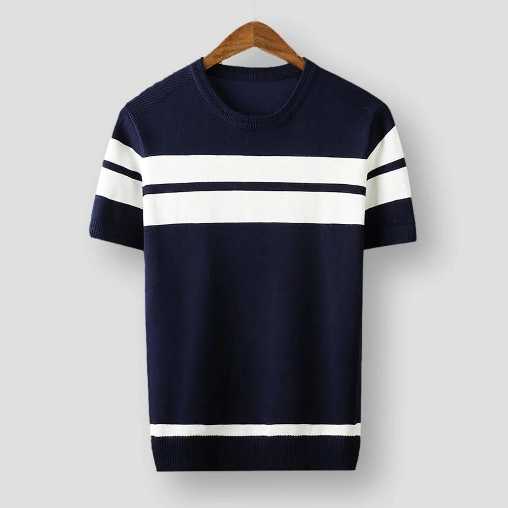 Step up the casual portfolio with this charming knitted shirt. Adorned with contrasting stripes across the chest, it instantly elevates any off-duty ensemble while the soft blend provides easy all-day comfort.