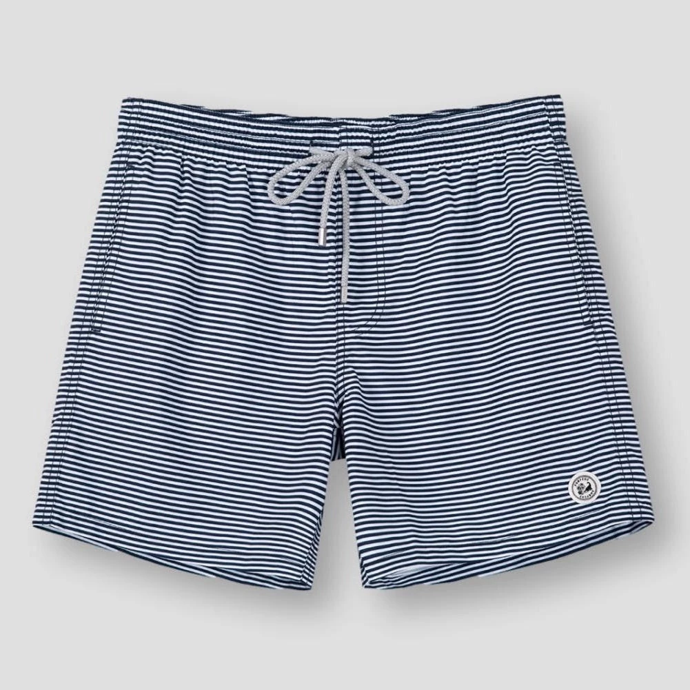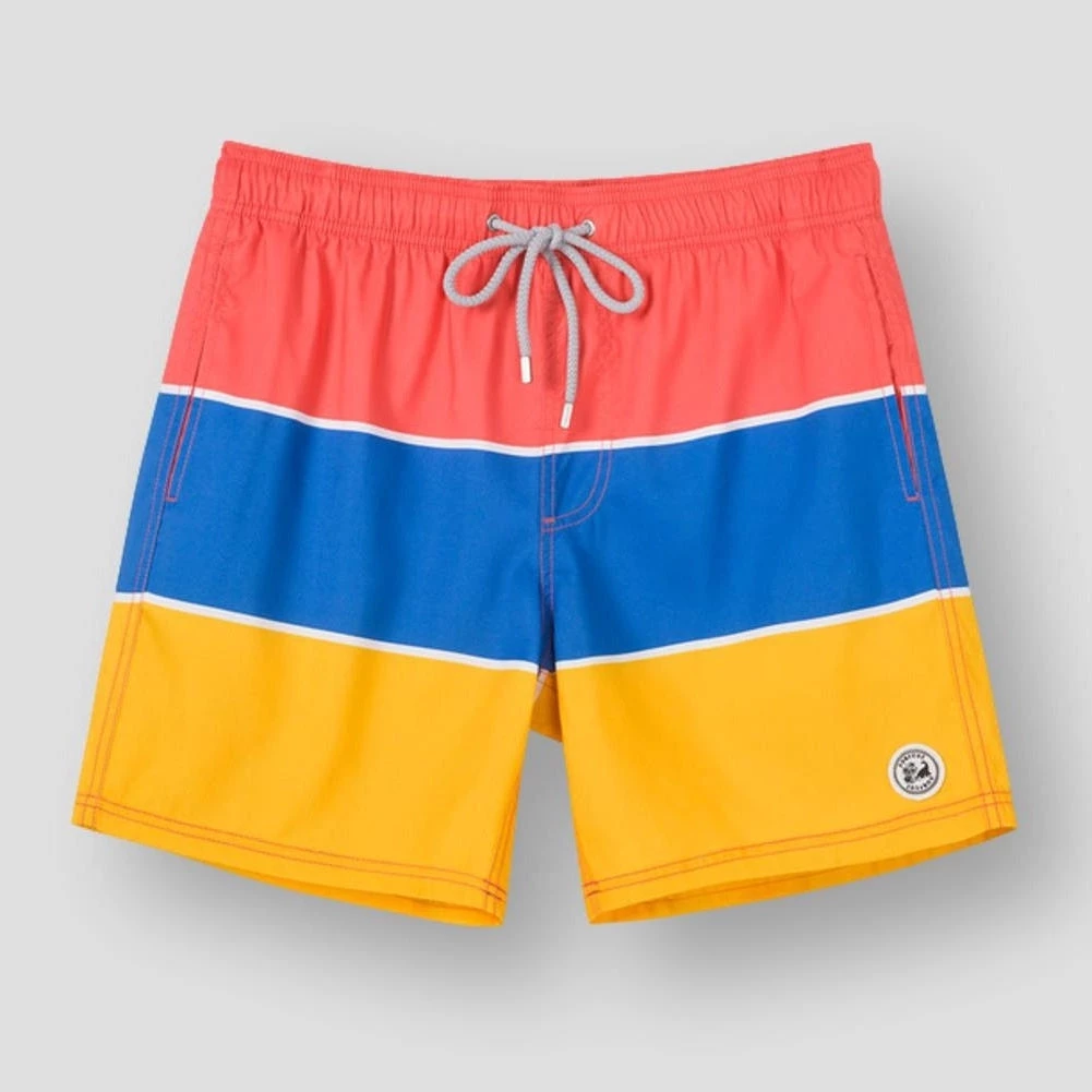 A lightweight, quick-dry blend lends easy land-or-sea comfort to these handsome swim trunks. Complete with an elastic waist for a custom fit, these shorts boast handy front pockets and a back velcro flap back pocket for keeping small essentials close at hand, and a vibrant print that elevates your beach-ready ensembles.