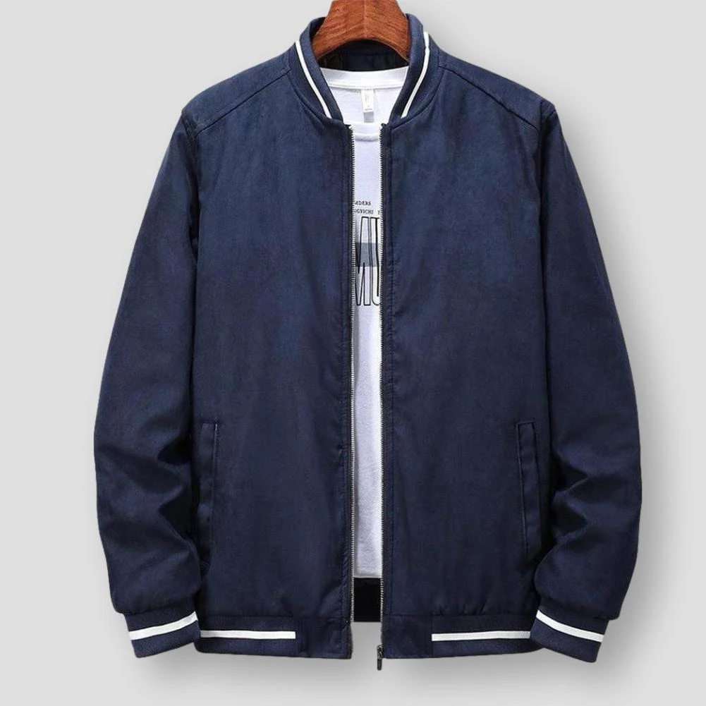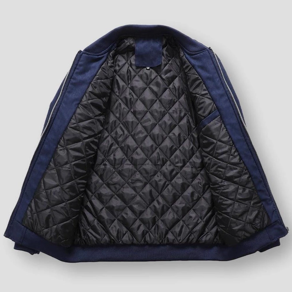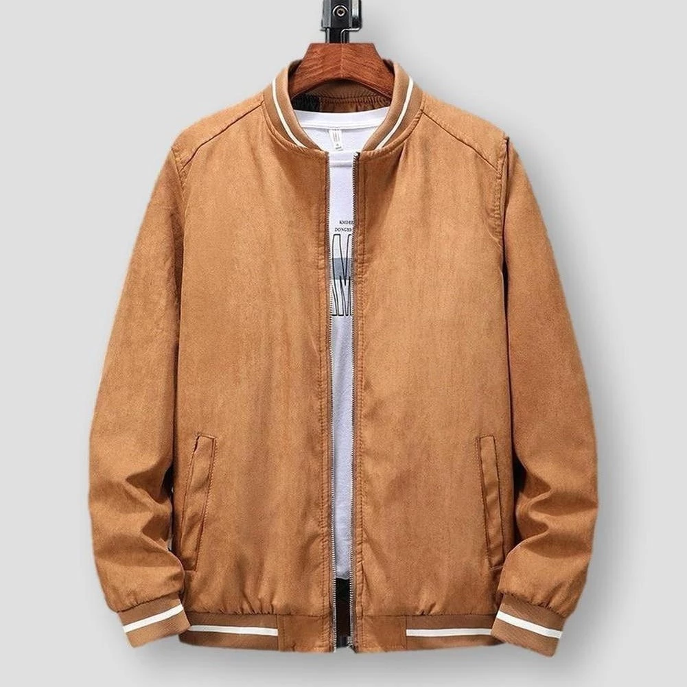 Soft quilted lining lends a delightful warmth to this suede jacket. Inspired by the classic baseball silhouette, this jacket boasts a sleek silhouette with a zipper fastening and striped details on the collar, cuffs, and hemline. Team up with denim jeans or corduroy pants for a refined winter look.
