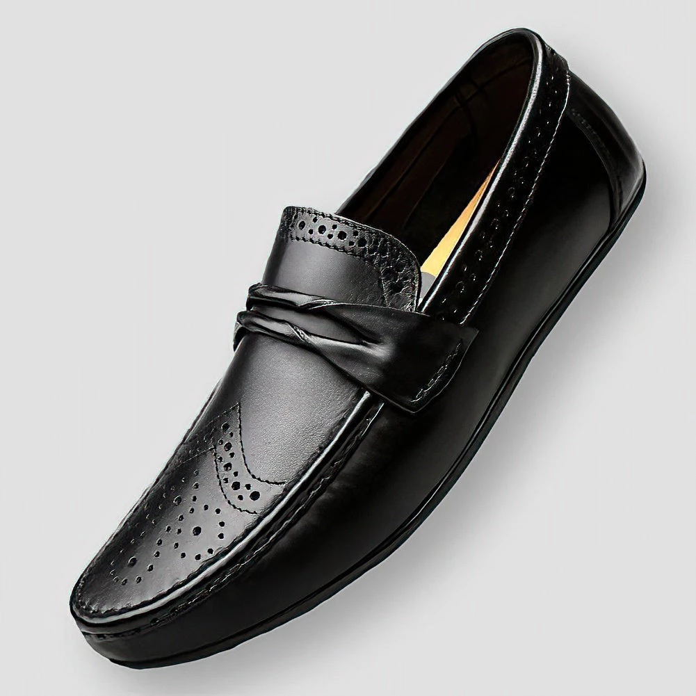 A myriad of perforations adorns these handsome smart shoes. Imagined in genuine supple leather, this pair displays a sleek slip-on design and rubber soles for unbeatable comfort from morning to night. Team up with tailored pants and a button-up shirt for a polished look.