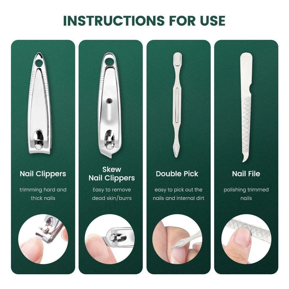 A neatly packed 7-piece kit for pristine grooming at home or on the go. Featuring clippers, tweezers, a file, a double pick, a trimmer, and an ear spoon, organized in a small, convenient leather bag that easily fits in any backpack.Â
