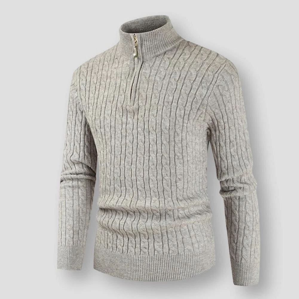 For a polished look and feel, opt for this classic knitted pullover. Made from a luxuriously soft cotton-kissed blend, this pullover boasts a turtleneck zip collar for added warmth and a solid color design that’s easy to layer. A perfect addition to the casual winter line-up.